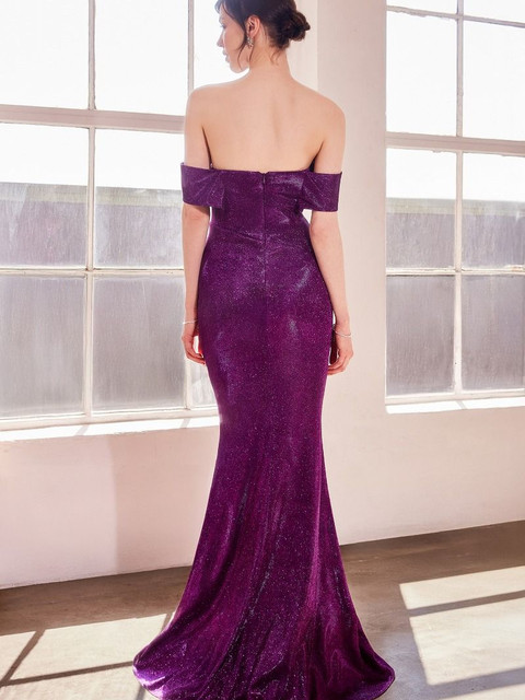 Sophistication meets celebration. This gown features a glitter reflective-changing material on a fit and flare bottom, a ruched bodice with straight neckline, full zipper back, and off the shoulder straps.
